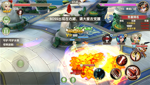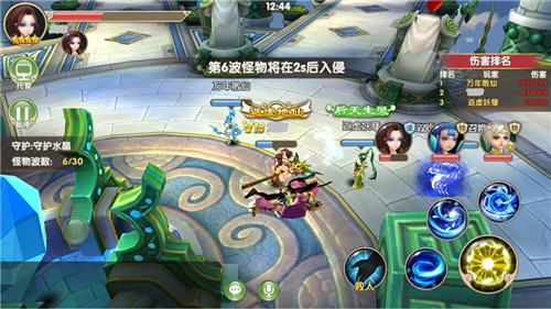 迫不及待地看完了说明之后,心急的我没有组到好友就开始了,系统为了照顾我这种勇敢的小伙,还特意安排了两个机器人角色。进入副本后发现,这个玩法以守塔的方式进行,一开始玩家会出现在水晶基地,满满的某LOL和某DotA的即视感呀,就是没有防御塔。一共有三条兵路,不过我们要的不是冲上去偷塔捣水晶,而是要击杀来袭的怪物、守住自己的基地。一共有30波敌人从三条兵路袭来,要在规定时间内守住水晶才算赢,想想都觉得害怕(⊙﹏⊙)b。