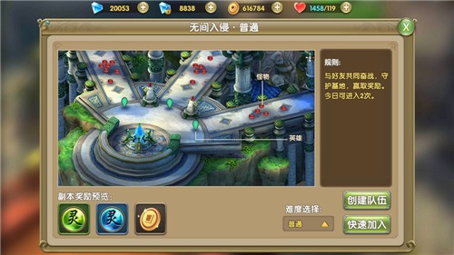 打开了“无间入侵”的说明页面,先来看看要求:这个玩法的开放等级是50级,是最多3人的组队挑战副本,每天可以进行2次。最关键的是,这个玩法新增了好友组队的功能哟。进入副本界面后还可以选择难度,角色等级越高可以选择的副本难度也就越高,当然了难度越大奖励肯定是越丰厚的。再等等,奖励物品中的“灵纹”是什么?嘿嘿,这个暂时先不透露啦,总之就是很宝贵的东西。
