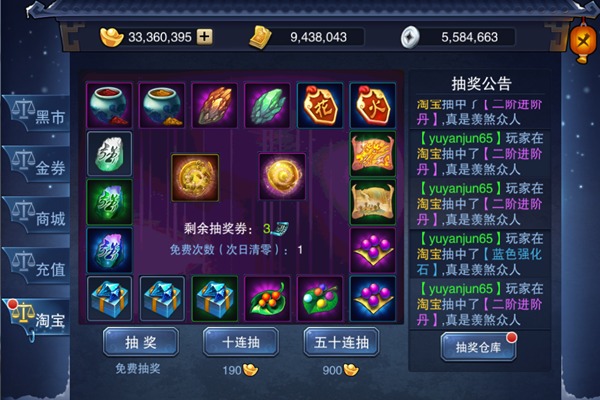 2、进入“淘宝”界面,能看到三种抽奖方式:抽奖、十连抽、五十连抽;连抽的次数越多,稀有道具中奖的概率越大哦~
