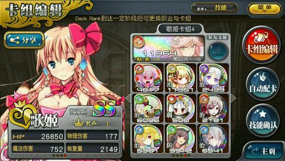 歌姬:保持团队血线,boss用aoe的回合,在团队血量允许的情况下用蛆娘,或者用水基佬给脆皮上魔防,歌姬要注意的就是血线,不要无脑上buff,死了人什么都是白瞎,关于克总7c打出比5c打出的效果就要好很多,7c打出更稳,而且还有2c可以用一张人妻,7c是爆发回合,基本全队都是火属性chain,如果你身上有便利屋和话唠的buff,人妻回复10000+血妥妥的。