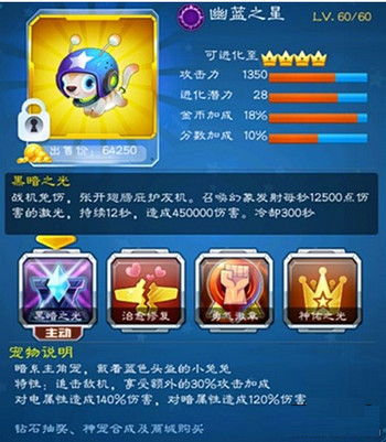 先来一张幽蓝之星开个场,看它这可爱的外表,戴了顶蓝色的钢盔就叫幽蓝之星了,许多玩家给它了一个简称叫“蓝狗”只需花1188钻石就可以将可免伤、加血、加攻、加分并召唤幻象发射高伤害激光的幽兰之星带回家哦,还在等什么,喜欢的玩家赶紧行动起来吧。
