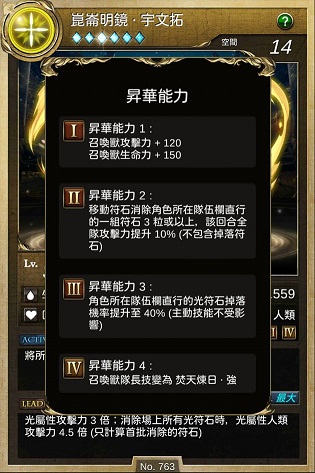 「崑崙明镜 ‧ 宇文拓」在满溢的昇华力量中,能以「焚天炼日 ‧ 强」领导光明族裔发挥圣光震怒之力,还在释放所有光元素力量之时,让光属人类全员击出超过 20 倍的绝杀攻击。