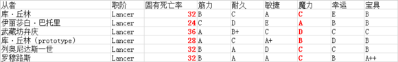 列出目前的Lancer职阶从者的固有死亡率与六围参数如下表: