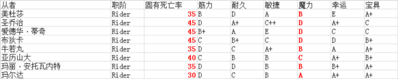 列出目前的Rider职阶从者的固有死亡率与六围参数如下表:
