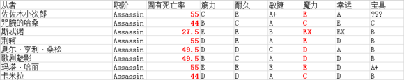 列出目前的Assassin职阶从者的固有死亡率与六围参数如下表: