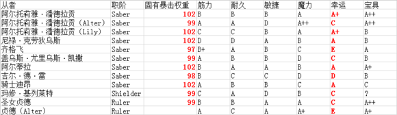 列出目前的Saber、Ruler、Shielder职阶从者的固有暴击权重如下表: