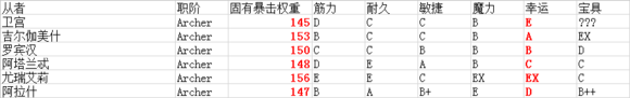 列出目前的Archer职阶从者的固有暴击权重如下表: