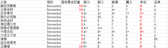 列出目前的Berserker职阶从者的固有暴击权重如下表: