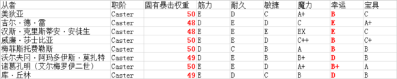 列出目前的Caster职阶从者的固有暴击权重如下表:
