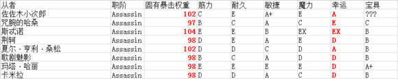 列出目前的Assassin职阶从者的固有暴击权重如下表:
