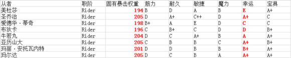 列出目前的Rider职阶从者的固有暴击权重如下表: