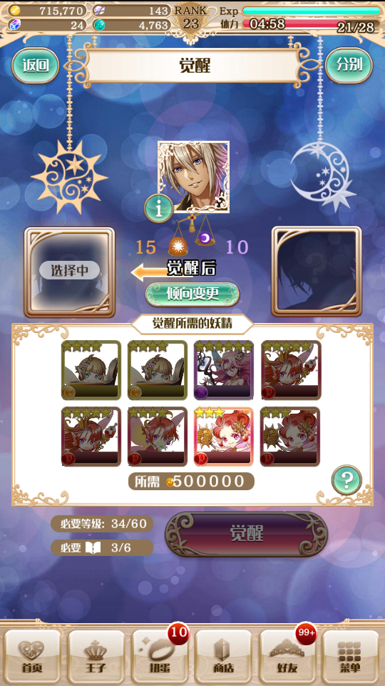 “觉醒”:前面讲过一点 现在讲详细一点 分日觉和月觉 觉醒后提升一个星级 日觉和月觉后王子的造型会发生不同的变化 技能也会有不同的提升 而觉醒后的剧情走向也有所不同 貌似有些王子月觉后有肉 影响王子觉醒的是太阳值和月亮值(?)这取决于在与王子的剧情中的选项【楼主发现比较善解人意的选项大多都是加太阳值的】 我们会发现王子下面有个秤 一个是太阳一个是月亮 等满级后剧情选项也走完了的话哪个值高就只能觉醒那种 如果一样高那就可以选择自己偏好的觉醒 如果想要月觉但是太阳值更高可以选择“倾向变更”然后用“月亮瓶”加月亮值