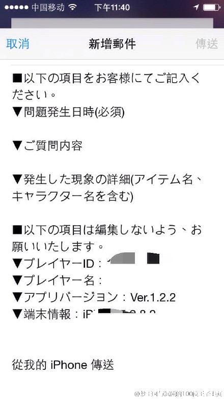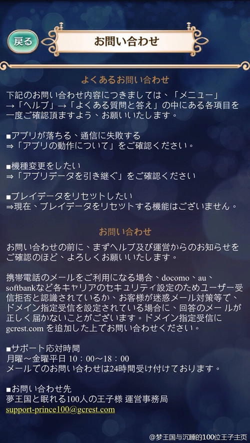1.左上角会显示游戏的版本号和你的游戏ID号,请记录好!如果没有记住自己的引继码,重新下载游戏后无法登陆的情况时,可凭你的ID和游戏名发邮件给官方要引继码的。2.右上角这个按钮就是输入引继码的地方,由于游戏卸载以后不会记着你登陆的ID了,所以重新下载或新登号,都要从这里输入你的引继码登陆。(不知道怎么查看自己的引继码请看之后的教程)3.给官方发邮件,support-prince100@gcrest.com,进去后直接点这个邮箱号就能发信,把你遇到的问题说一下,比如报错9000、不记得引继码、充值有误等。切记记得写上自己的ID号和名字,如果是充值问题,附上充值记录的截图。(如果手机有绑定邮箱,会直接弹出格式,按提示填写就好,最好用日语。)特别是忘记引继码的情况,能提供证明此号是你的信息越多越好,比如生日,昵称,等级,有多少王子等等,官方调查完没问题就会回信给你引继码了。