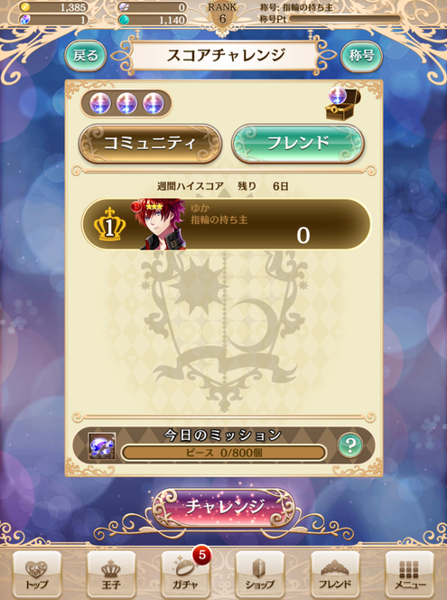 “挑战模式”:打挑战分会送钱和木材还有称号点数 分数越高得到越多 打挑战需要晶球 晶球栏未满时每小时回复一个 好友之间和公会成员之前每天可以互送一个 挑战有三种 前两种每次挑战需要一个晶球 第一种就是随机出颜色不一定相同的四个怪 第二种冷酷挑战是出同一种颜色的四个怪 克制怪物颜色的王子越多可以加额外分 第三种和第一种差不多 不过打一次需要三个晶球 奖励也会翻三倍 每次挑战完给1000金币、100+分数/10000个木材、100+分数/10000的点数pt pt越高称号也会升级 每次升级都会送钱或妖精石或指环碎片 当达到目前最高的340000pt时会送一位王子 我忘记是四星还是五星的了 应该是五星的吧?