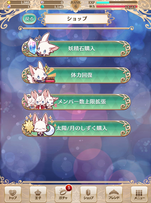1.金币:游戏中会掉落,用来升级王子和觉醒王子,觉醒等级越高的王子需要的金币越多,要刷大量金币,可以周末的时候在EVENT刷狗狗,把狗狗卖了就好,别犹豫,狗狗就是用来换金币的。捞池子也有概率会出,也可以卖其他道具卡或王子,只是没有狗狗的多。碎片:玩挑战模式,每天的任务完成后会给10片,卖三星以上王子也会有,用碎片可以去交换所换取王子和道具。妖精石:氪金项目,作用:捞池子抽三星以上的王子;增加卡槽5格子上限;加满体力,游戏中挂掉复活并加满王子的技能槽;买太阳/月药水来改变王子觉醒的倾向。部分活动中会作为奖励,梦世界地图上标记着妖精石图案的地方,刷到四宝箱打开后会给一个,收到了就没有了。