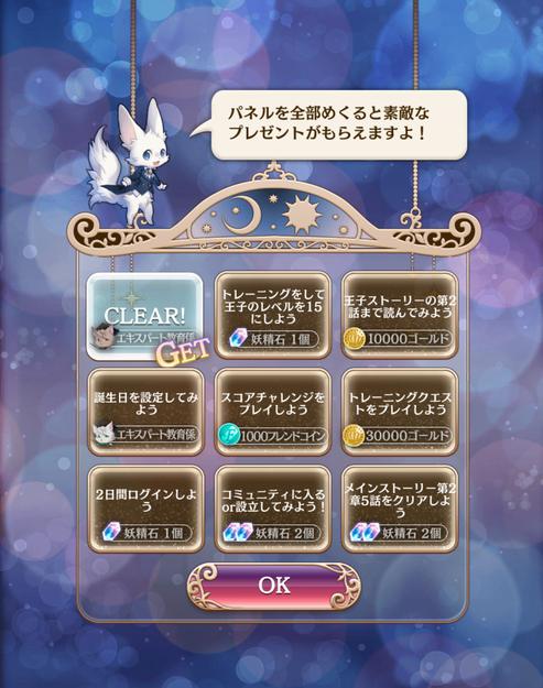 7.礼物盒:一般大宝箱里的东西打开就会进入礼物盒,在卡槽里找不到自己的奖励了就去礼物盒里找,还有节省卡槽的方法就是把暂时用不到的奖励放在盒子里先不领取。8.新手任务,基本上游戏每个角落都玩一遍就能达成了,9个任务都完成后会给图上的王子一个 。