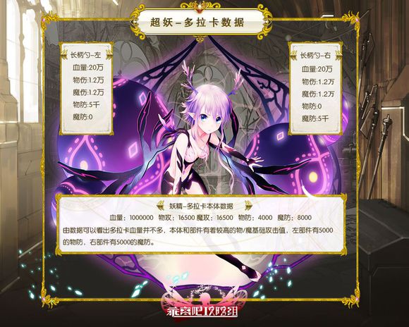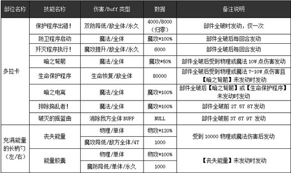 由上表可以看出多拉卡血量并不多,本体和部件有着较高的物/魔基础攻击值,左部件有5000的物防,右部件有5000的魔防。