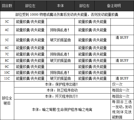 部件全破前的boss本体仅会在2、5、8回合(即4/7/10C)释放魔法aoe,并在3、6、9回合(即5/8/11C)清除玩家所有buff效果,而部位全破后的boss则进入狂暴,清零我方防御,每回合增加魔攻并释放魔法aoe,若继续对其造成伤害还有可能触发8w的全体治疗十分麻烦,所以务必要将boss和部件一起消灭。