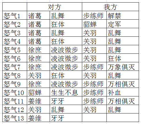 这是一场打了13怒的卫将军战役,比较激烈。我们来简单分析一下战斗。先看看双方都放了什么技能。