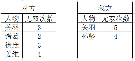 对方4金将,出无双累计12次,我方2金将,出无双累计9次。这里我们简单看一下,无双技能会不会卡的问题,对方关羽是临近结束才被击溃的,总共放了3次青龙怒,而我方关羽,则放了5次青龙怒,由此观之,无双是绝对会卡的,而且次数还不少,对方被卡掉了2次青龙怒,其实对战局影响也是很大的。我方2个金将,基本没有卡过无双,因为孙坚比较早被击溃,所以施放无双是4次。
