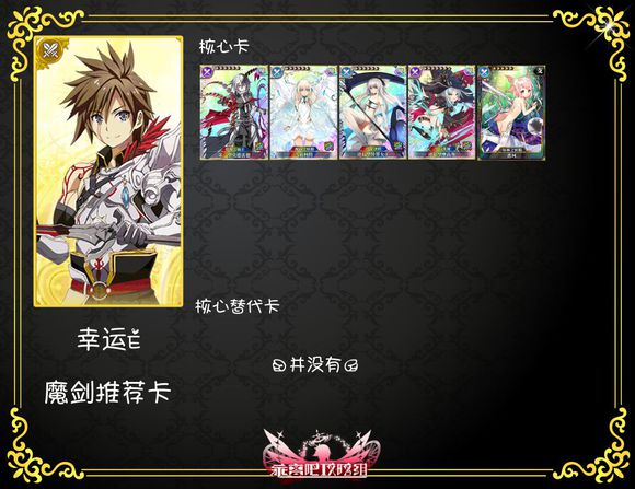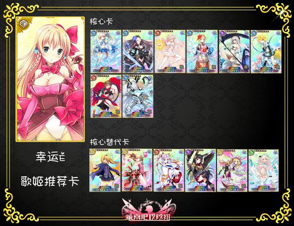 可物可魔,双修也可(但是要有清晰的算牌意识以及7c后的抽卡运)。3~4c不需要叠buff,保证每回合给刀一下攻击即可,卡手请务必打信号。5c魔兵可以开始用莫受叠buff,6c雪梨+女王,7c大姐或普卡+水系魔刀输出;物兵则6c用足球+壕夏娜叠buff,7c美腿舰炮破刀。之后注意磨血以及同时带走枪和本体即可。