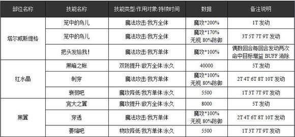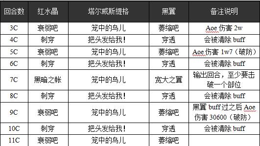 通过行动模式我们可以看到,暗妖不但会使用破防的攻击,同时也会给予我方成员攻击力下降的永久debuff,偶数回合也会清除被本体点名人员的buff。所以上buff要注意时机,如果上个克总被超妖点了富豪和佣兵的话,就等于白加了……因此不要过于依靠复数回合的buff,单回合buff使用更为方便。注意7c一定要破一个部位,如果没破红水晶的话,红水晶双防会变成65000……本体也有55000双防,配合超妖的清buff和降攻,就会变成一场消耗拉锯战;如果没破黑翼的话,9c一波aoe,破防80%并有30600的裸伤;如果都没破的话,你将会遇到一个防御高的要死,输出强的惊人的超级赛亚妖……