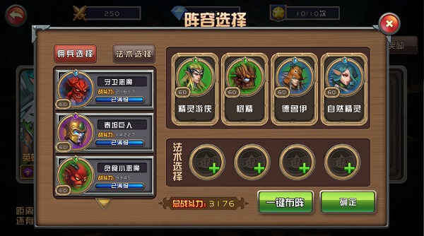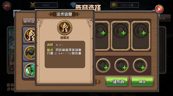 玩家可以通过左侧的佣兵选择,进行佣兵上阵,也可以点击法术选择,进行法术佩戴