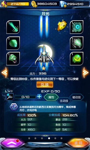 月光:从地球赤道附近的新西兰采集到月光精华,铸成神器月刃,亦光亦电,削铁如泥。主要技能:获得月光的祝福,25秒内击杀的敌机会获得额外的分数加成