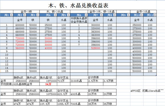 首先,我们了解下用金币兑换木、铁、水晶的收益表,其中全力换水晶的时候涉及到先用金币换木铁,再用木铁换水晶。在学习书的过程中,也可以参考类似理论,先金币换木头,再用木头换铁,请灵活使用。