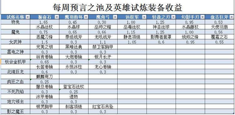 首先让我们看看每周固定的日常可以获得哪些装备,已经将碎片按照每周各试炼及预言次数折合,这是在不考虑工会战兑换和远征币、副本币、竞技场币、圣域兑换的前提下计算得到的。