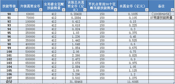 当我兴致勃勃的将博学升到40+,等级晋升到92级的时候,看到每级技能需求金钱,呵呵,这也是让很多老区人穷的揭不开锅的重要原因,按照1个月升2级半为例,你们自己看……想要全英雄全点技能,按照博学70,等级100为例,需要31亿金币,这是个连日入3000万的神豪都要连点100天的价格啊!如果是平民玩家,挑上竞技场、巅峰常用的30个英雄点点就可以了,现阶段每个月光点技能的支出,消耗大概是1.5亿……