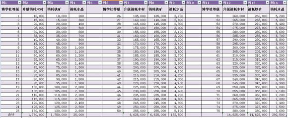 除了火猫的天赋、船长的水刀、小小的石化装甲这些特殊计算以外,其余技能大概是这样的,大部分是铁比木多,少数是木头占大头,木铁水晶每级消耗1级1W/4W,2级2W/8W/20,3级4W/16W/100,4?级8W/32W/300,5级16W/64W/500,特殊的给技能的书本1级4W/4W/20,2级8W/8W/100,3级16W/16W/300,4?级40W/40W/1000,5级64W/64W/2000,其中特殊书的3级为估测,没有详细数据但是应该大差不差。