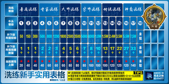 首先洗练分为两个阶段,我个人将洗练划分为升到14?级别开传说及120上限,升到16?级开神裔和16之后开140上限三个阶段,因为开启的上限越高,金币洗练效果越好,开传说洗练之后,能洗到100质变,开启120上限以后,三洗100难度大幅度降低,开启神裔以后,不容易遇到每日神裔钻石洗练降属性的情况。分别对应新区、半新区、老区的现状。且看一区大神统计出来的表格,向制表的大神们致敬。