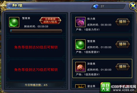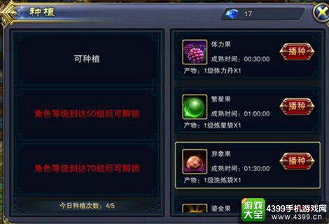 种植栏:当玩家角色分别达到30级,50级,70级,系统会自动多开放一个种植栏,最多可开放3个种植栏。