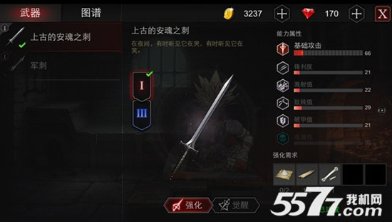 4.选择下一个等级的标牌,在右下角会出现该武器强化所需要的素材和金币,而且强化后的属性改变也会显示出来。当我们已经有足够的素材强化武器时,点击强化就可以了。如果没有素材的话,那么只能去副本中收集了。点击素材的图标,就会出现该素材的信息以及掉落地点。