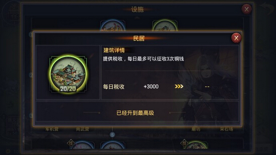 民居:提供税收,每日最多可以征收3次铜钱,必要时可使用玉符强征。前期按照任务指示稳步升级,后期可按实际需要收入进行升级。
