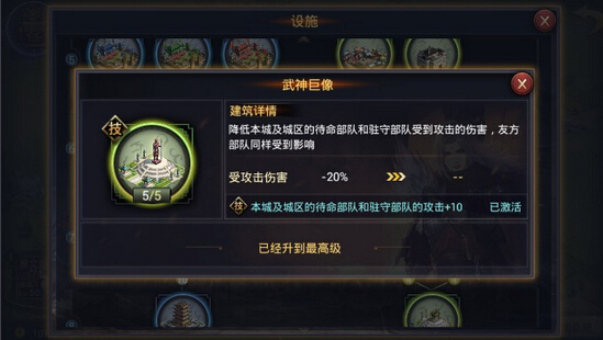 4) 武神巨像:降低本城及城区的待命部队和驻守部队受到攻击的伤害,满级受攻击伤害-20%,同时激活攻击+10,是后期重点发展设施。