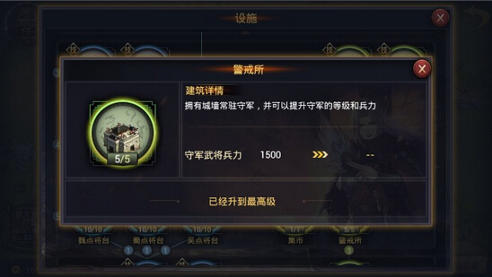 2) 警戒所:使城池拥有城墙常驻守军,升级可以提升守军的等级和兵力,满级守军武将兵力是1500,是偏后期重点发展设施。