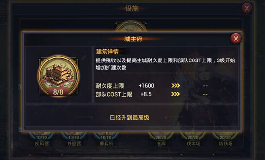 1、 城主府:提供税收以及提高主城耐久度上限和部队COST上限,主要作用是坚固主城和使部队可同时配备高COST值武将,3级开始每升级一级可扩建一次。升级所需资源较多,但对整体科技树设施走向发展十分重要,建议屯资源稳步升级。