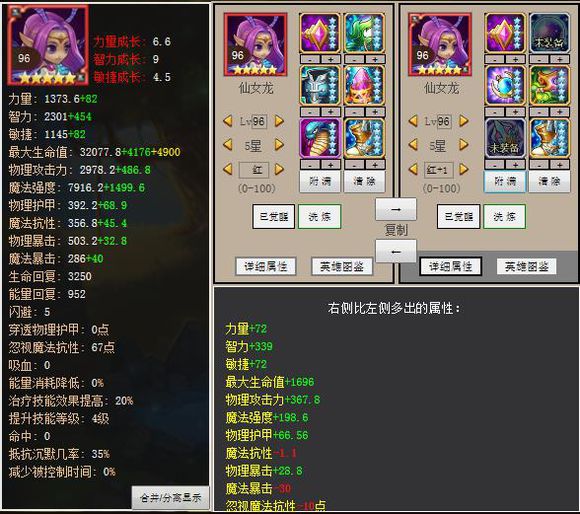 点评:法系一姐仍旧是热门选手,对抗法系的克星,存活能力超强。96级的仙女龙总体属性均有提升,特别是护甲增加很多,在物理队面前能更好的生存,值得进阶。