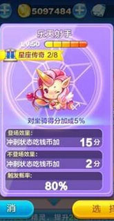 乐天射手:登场效果为冲刺状态吃钱币加15分,不登场效果为冲刺状态吃钱币加2分。乐天射手满级50级,满级后技能触发概率为80%。获取途径为勇气赛道奖品兑换。