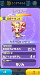 勇气白羊:登场效果为变大状态吃钱币加22分,不登场效果为变大状态吃钱币加4分。勇气白羊满级50级,满级后技能触发概率为80%。获取途径为在充值活动中获得