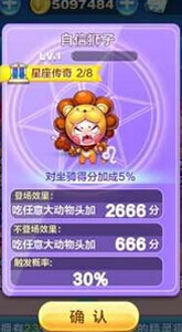 自信狮子:登场效果为吃任意大动物头像加2666分,不登场效果为吃任意大动物头像加666分。自信狮子满级50级,满级后技能触发概率为80%。获取途径为参加俱乐部联赛获得。