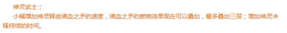 神灵武士开场技能循环为普攻1次→血沸之矛→回血→普攻1次→血沸之矛→普攻两次→血沸之矛。之后按照这个顺寻循环(回血→普攻1次→血沸之矛→普攻两次→血沸之矛→回血)