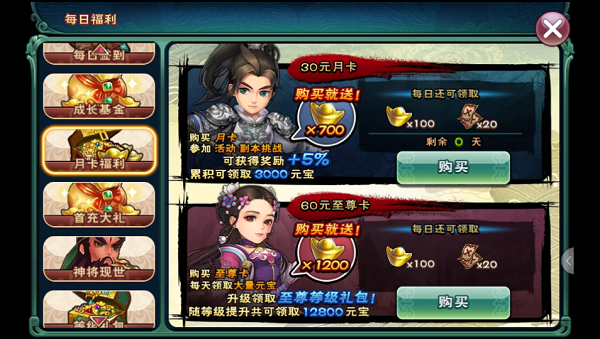 1、月卡&至尊卡(都是购买后每日返100元宝和20扫荡卷,一个是30天,一个是终身)