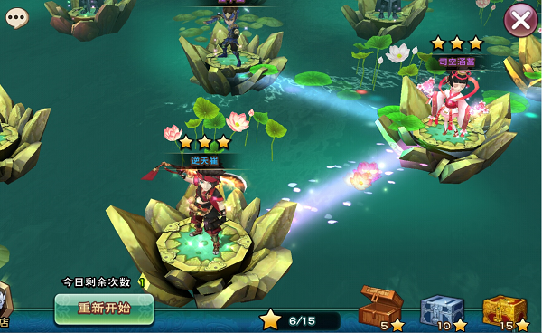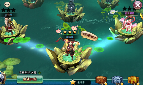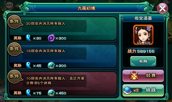 2.幻象有蓝、紫、橙三种品质,奖励依次递增,难度也递增。这个是系统自动判定的难度,具体的需要看个人,毕竟阵容的针对性系统是不可能一一考虑进去。点开幻象可以查看奖励和布阵,针对性的布阵很必要的,在越少的回合获胜、存活越多的武将,获取的奖励的将更丰厚,获取的星星数量也越多,打够5个、10个、15个星可以领上图右下角的宝箱奖励的。这个时候就需要看自己需要的奖励,选择自己能战胜的幻象。