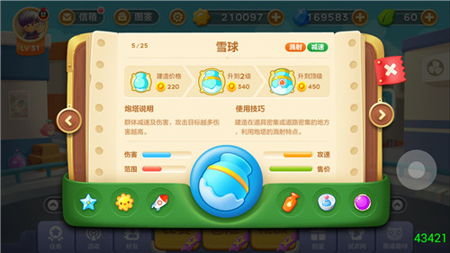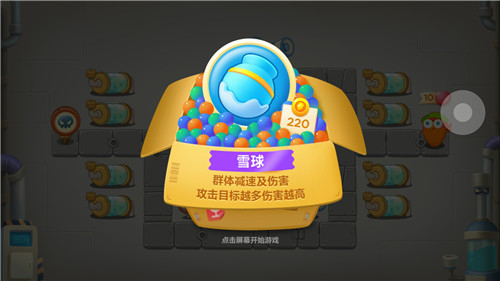 减速炮塔家族的另一个成员是冷冰冰的雪球炮塔。和冰冻星一样,雪球同样有群体减速效果,只是在减速效果上,雪球没有冰冻星那么强悍。但是,雪球是罕有的减速、攻击双系炮塔。如果说冰冻星的攻击力比较低,只能算是锦上添花,那么雪球则完全可以作为攻击炮塔使用。