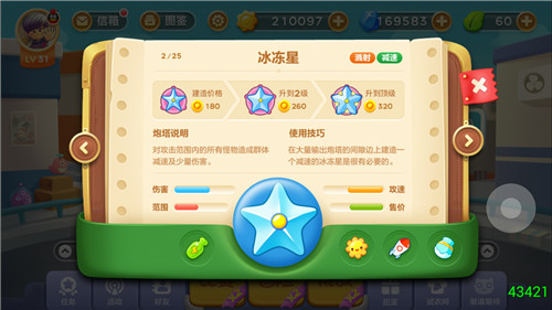别看减速炮塔家族里只有两位成员,但它们的能力都不简单。首先,是亮晶晶的冰冻星。它的技能是对攻击范围内的所有怪物造成群体减速及少量伤害。光“所有怪物”这四个字,就足以说明冰冻星的厉害程度啦!来一个打一个,来十个打十个,就是这么霸气~