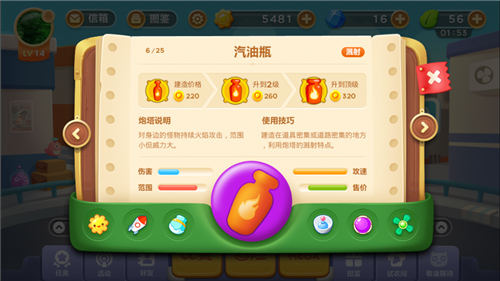 汽油瓶具有满速的攻击能力。虽然汽油瓶输出伤害低,但是它的快攻特性极大弥补了伤害的不足。在关卡开局后,各位萝卜丝可以在怪兽出口附近建1-3个汽油瓶炮塔。前期炮灰级的小怪就是为汽油瓶送菜来的,而汽油瓶在攻击怪兽间隙还能清理较大范围内的障碍物,为后期建塔积累海量资金。在关卡中后期,汽油瓶炮塔可以批量建设,成片的汽油瓶能将伤害输出到极致,怪兽们能通过的几率基本为零。汽油瓶也可以协同减速炮塔和高伤害单体炮塔共建攻击群,比如汽油瓶、冰冻星、拳套能形成互补的攻击优势,让怪兽寸步难行。