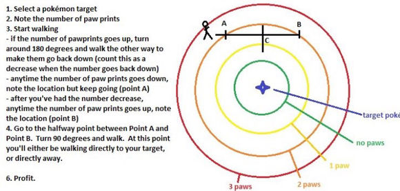 然后回到中间,选择一个方向继续前进,比如说往西,假如脚印变多,则往反方向前进,如果脚印数一直不变,说明就在左上角这一块了,优先寻找有口袋站与道馆的附近。